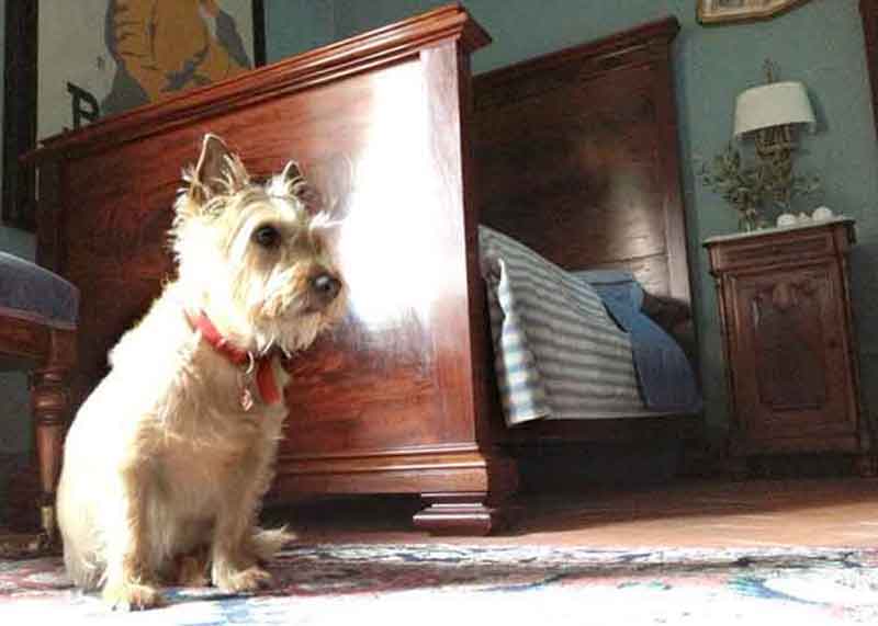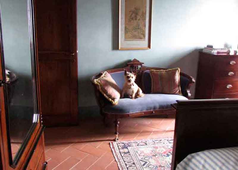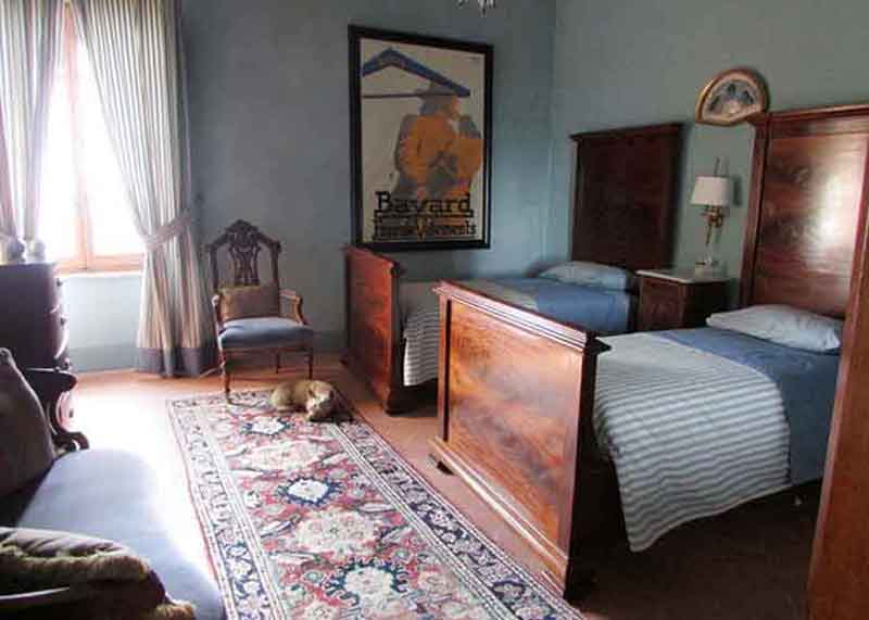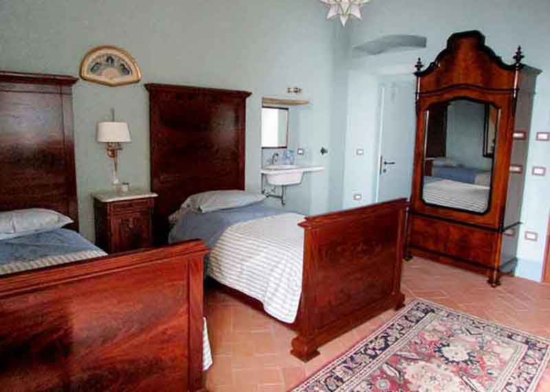 This wonderful bedroom on the Piano Nobile (main floor) of the palazzo is beautifully furnished with antiques and two comfortable single beds. The room has tall ceilings and a window that looks out over the valley toward Assisi. There is a private bathroom, toilet, sink, and shower.