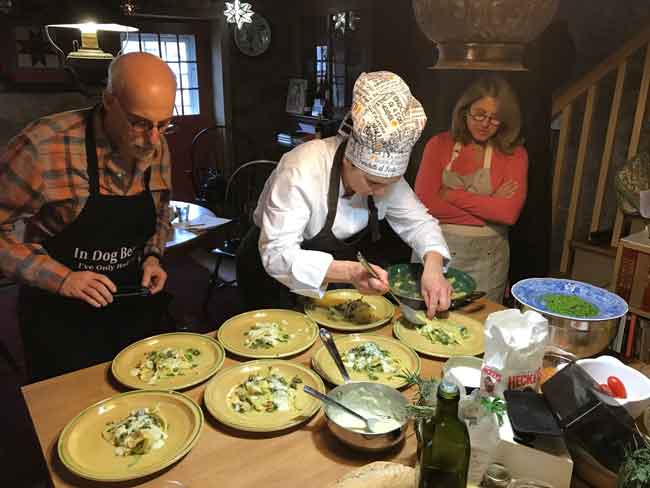 Three-hour classes (plus the meal) are offered mid-November till end of March and cost $100 per person, per lesson. (Prosecco is served and guests bring additional wine for meal). Gift certificates available. (For 4 to 8 people.)
